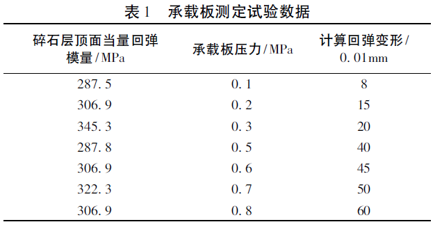 试验路段的破碎施工完成以后,要对该路段的水泥混凝土板进行承载板试验,主要是对破碎后碎石化层顶面的回弹模量进行测定。表1为承载板测定试验数据。通过计算可以得到破碎后的水泥碎石层顶面的当量回弹模量,为309.2MPa。